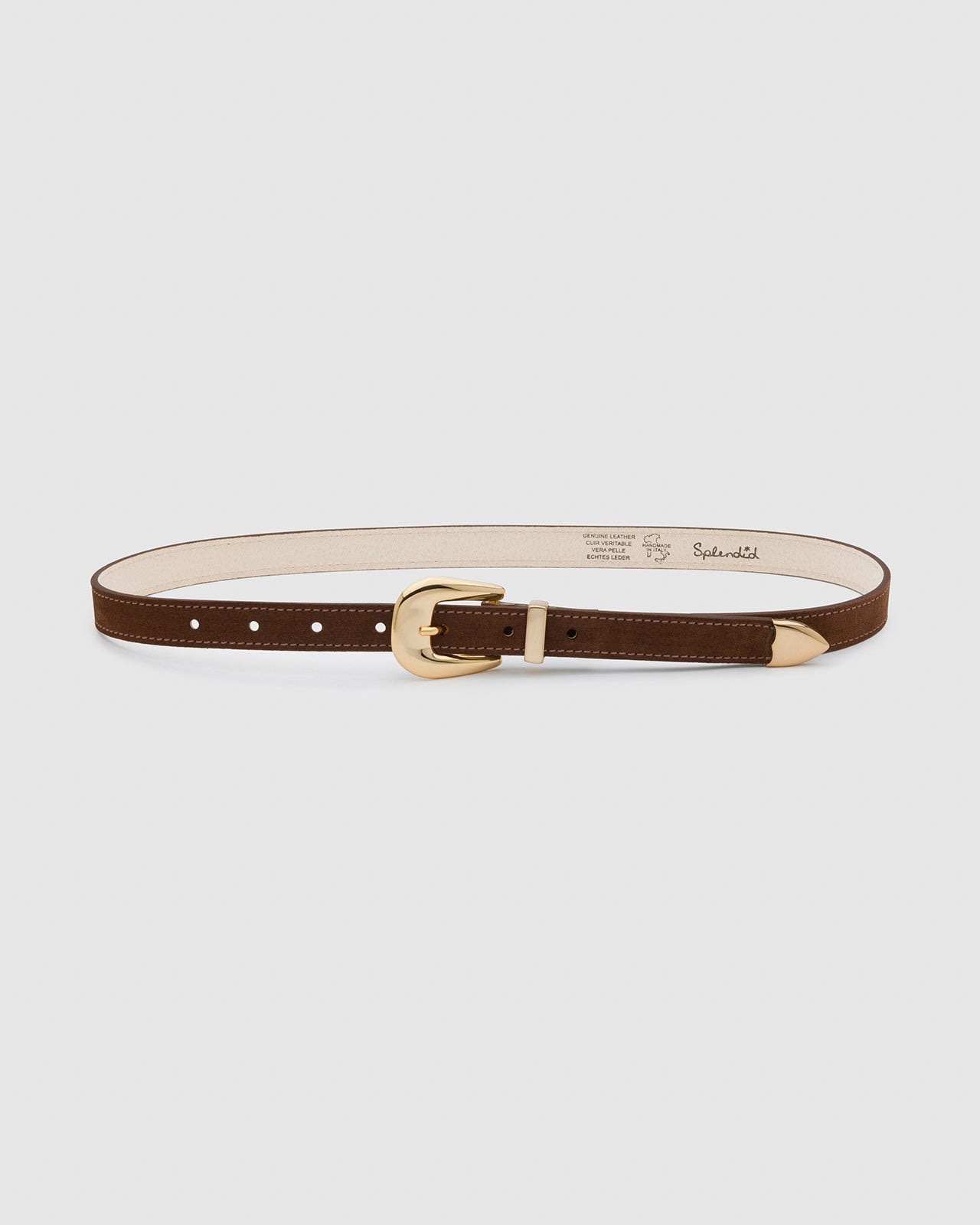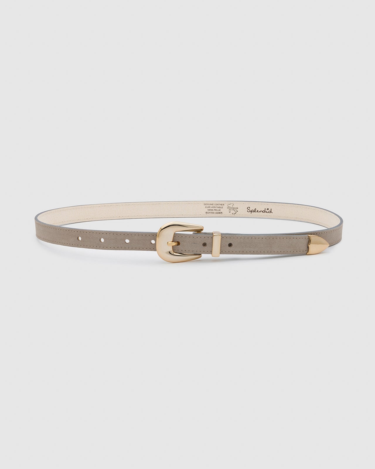 Our skinny suede belt is a must-have for any wardrobe. Made with Italian suede and a light gold-toned buckle, it adds a luxe finishing touch to any look. Made with Italian suede Light gold-colored buckle